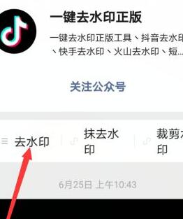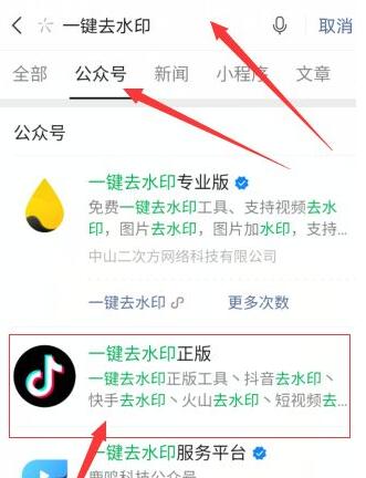 在搜索框框输入一键去水印,然后进入界面,再点击公众号,弹出下面界面,点击抖音的【一键去水印正版】。