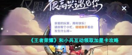 王者荣耀七周年怎么和小兵互动?王者荣耀七周年活动还在继续,游戏中也出了一些的新的皮肤,以及带来了很多的活动内容,其中有一个和小兵互动的活动玩法,是不是感觉很有意思的样子,而且达成了互动的要求的话可以获得游戏的加星卡的奖励,还是很多的小伙伴们都非常好奇怎么和小兵互动的吧。这个平常在游戏中一丝不苟的进行着机械式的攻击,这些固执且一成不变的小兵其实还是很可爱的,怎么和这些小兵互动呢,下面就一起来和小编看下下面的文章分享王者荣耀七周年和小兵互动领取加星卡的攻略吧。
