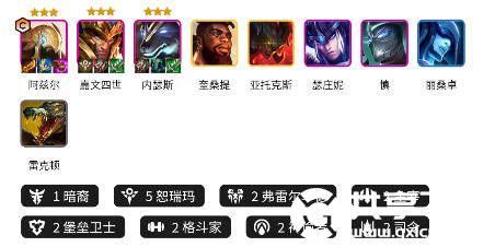2、阵容羁绊:1暗裔+5恕瑞玛+2弗雷尔卓德+2主宰+2堡垒+2格斗+2神谕+2司令