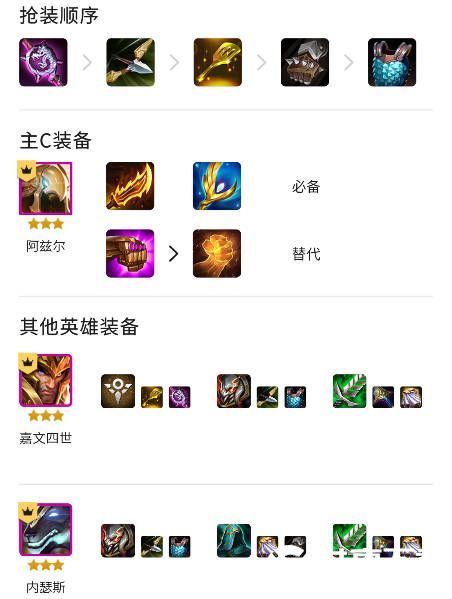 (1)阿兹尔的装备羊刀必备,恕瑞玛羁绊能给阿兹尔提供较好的续航,大天使可以进一步提高阿兹尔的持续作战能力,法爆可以作为大天使的下位替代。