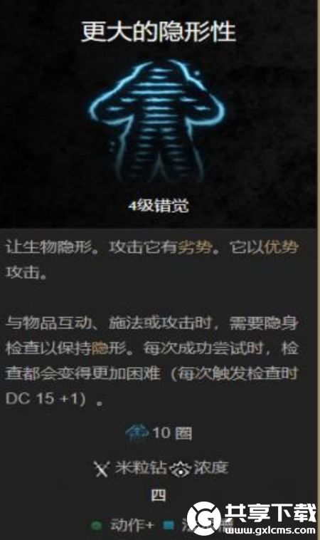 博德之门3高等隐形术效果是什么?博德之门3是一款非常有趣的回合制角色扮演游戏。玩家可以自由探索游戏中的世界,完成各种任务和活动,与其他角色互动,体验策略性和挑战性的战斗系统。游戏中有着十分庞大的世界,几乎涵盖了所有的地形地貌,每一处都还分布着各种各样的生物和秘境,玩家可以在其中自由探索。游戏中的剧情玩法十分有趣,玩家的每一个选择都会决定最后的结局。游戏中的战斗系统也非常有趣。玩家需要根据自己的角色和装备,选择合适的战斗策略和技能,与敌人作战。每个角色都有不同的技能和属性,所以玩家需要根据自己的喜好和战术,合理地选择角色和装备。这种战斗系统可以让玩家体验到策略性和挑战性,还可以让玩家更好地了解自己的角色和装备。相信很多选择吟游诗人、巫师这两个职业的小伙伴都使用过高等隐形术,这是一个幻术系4环法术,小编把它的效果介绍放在下面的内容中了,大家感兴趣的话可以看看。
