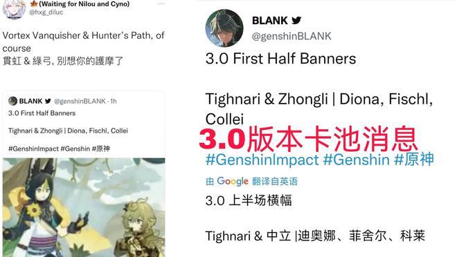 根据Blank消息,3.0版本上半卡池(8.24-9.13)→提纳里+钟离+柯莱+迪奥娜+菲谢尔。另外,武器池大家不要乱猜了,早确定了,没有护摩之杖,上半提纳里专武猎人之径+钟离专武贯虹之槊,下半甘雨专武阿莫斯之弓+心海专武不灭月华。