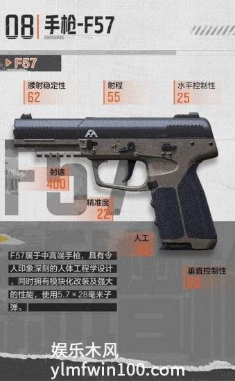 F57是一把使用P90同款5.7*28毫米子弹的强力手枪,由于新版本为5.7*28毫米子弹新增了五级穿透的弹种,让这把手枪的威胁度同样不俗,60的垂直后坐控制,81的人机工效和55的有效射程在手枪中名列前茅。