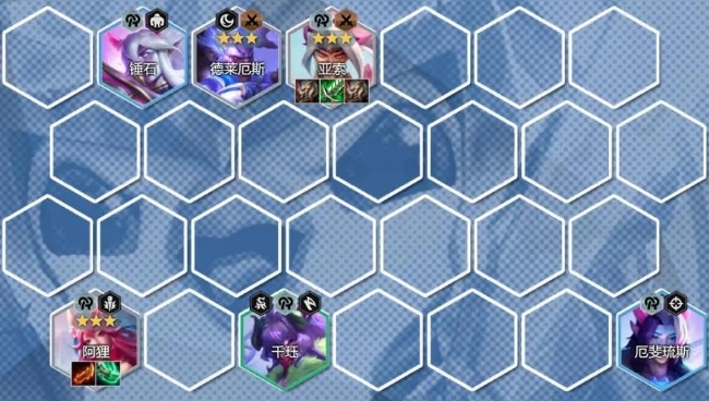 亚索3星后就卡着50金币升人口,6人口补锤石与厄斐琉斯开出5莲华羁绊,记得亚索一定链接锤石,不然没有坦度这是核心。
