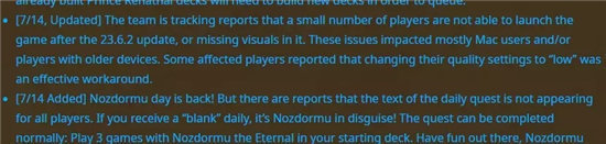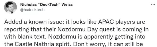 诺兹多姆日回归!不过有报告指出该任务的文本丢失,如若你收到一个“空白”的每日任务,那就是诺兹多姆乔装打扮的!此任务可以正常完成:在你的起始套牌中加入【永恒者诺兹多姆】,完成3场对战。玩得开心点儿,诺兹多姆的粉丝们。