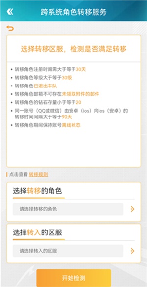 4、进入跨系统角色转移服务界面,点击开始转移即可,填上自己要转移的角色和区服。