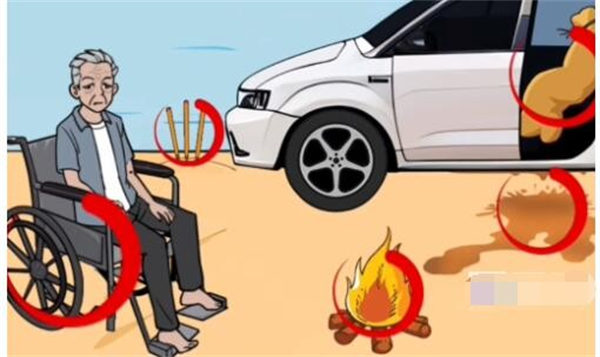 4. 最后将男人放在轮椅,妻子放在帆船上:将男人放在轮椅上,妻子放在帆船上。然后点击沉船、三根香、车漏油了、麻袋、篝火以及轮椅等疑点。