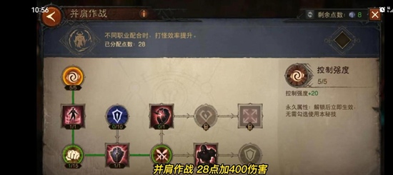 6、并肩作战28点为我们增加400伤害。并肩作战左下角的破甲不需要全部点亮,只需要点1点就可以继续往下点了。