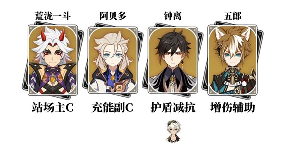 2)输出手法:荒泷一斗E叠层,钟离长E加护盾和减抗,五郎E加BUFF,阿贝多E充能和打伤害,接着荒泷一斗AA+QAAA+重击+EAAAA+重击,循环即可!(如果钟离换班尼特的话,班尼特在后面荒泷一斗上场前开Q,然后荒泷一斗开Q)