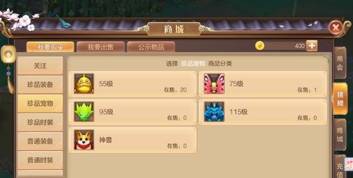 宠物类:宠物分为lv55、lv75、lv95、lv115和神兽五大类别,也就是说只有珍品宠物才能拿得上摆摊系统。