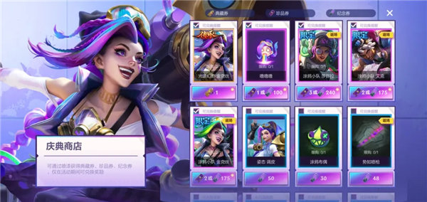 (3)典藏券可兑换传承皮肤-光谱幻影 金克丝,珍品券可兑换动态表情-噜噜噜、涂鸦小队系列返场皮肤等珍稀道具,纪念券可用于兑换击败印记-涂鸦布偶等道具;