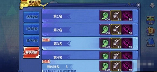 当周,每到达新的段位会立即获得该段位的奖励,具体段位名称,大家可以参考游戏中的说明,那么我想说的是建议每天额外买3次巅峰对决的次数(每次20魂玉,一周是420魂玉),因为这样做不仅可以尽早取得更高的分数,同时也会获得相应更高的段位,从而获得更多的魂玉。