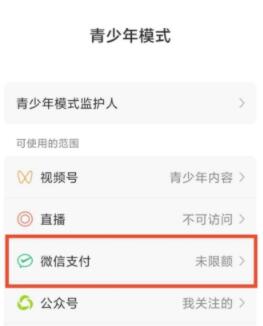 2.在青少年模式中首先由父母设置“青少年模式监护人”并开启相应的青少年模式密码。然后点击下方的“微信支付”选项。