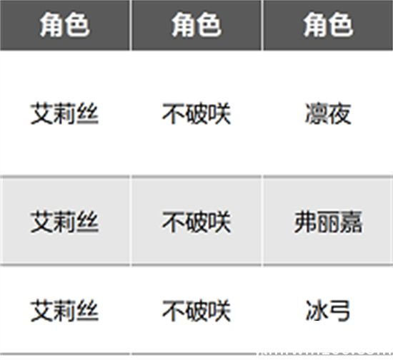3.艾莉丝+凛夜/弗丽嘉/冰弓/不破咲任意两把武器,如果萌新也可用冰锤(烯),或者梅丽尔的武器搭配过渡一下。