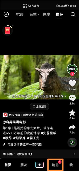 1.打开抖音,点击下面的消息。