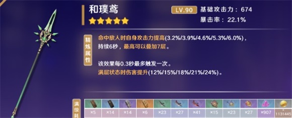 高贵的暴击率区间,魈的专武,随着攻击命中敌人时会不断提高3.2%攻击力,至多7层,叠满后额外提高12%元素伤害。适用于长轴角色,同样赛诺也可以使用,在输出方面没有赤沙之杖那么有优势,但是也总比四型武器要强。如果携带和濮鸢,赛诺基础攻击力就会很高,因此推荐时之沙携带攻击力。