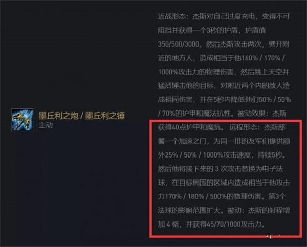 而技能开启还能够获得25%/50%的攻速,第三次伤害还是群体AOE的伤害,总的来说只要能够撑到杰斯开启技能,后续的伤害是能够直接拉满的。