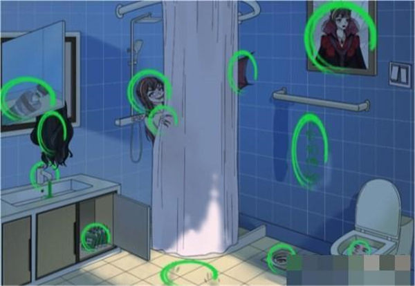 1. 在浴室风云关卡中,需要找出十二处细思极恐的元素。它们是:绿色液体、可疑液体、乌黑长发、诡异眼眸、可疑字迹、怪异人脸、古怪肖像、恐怖利爪、青面獠牙、受害者、拖拽痕迹、蝙蝠翅膀。