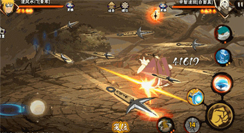 青年水门会向前方扔出若干枚飞雷神苦无,随后在苦无之间反复瞬身穿梭,打出多段连续攻击。命中后会标记对手,且该技能在空中也可发动。