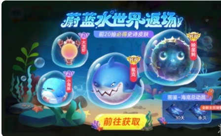 在3月22日~4月7日,备受好评的皮肤蔚蓝水世界也将返场。这一次,球宝可以参与活动,与深海联萌·鲨克、映星鲀、暴走大虾、胖头鱼鱼等海洋生物结缘,并解锁新图鉴[海底总动员],赢得额外奖励!