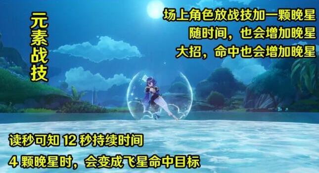 元素战技「垂裳端凝之夜」,脱手护盾+脱手挂冰。释放时对周围造成冰元素伤害(河面都冻结了)并展开一个冰盾。从演示来看,期间有3种方式产生晚星:当前场上角色释放元素战技;随时间增加;大招命中产生。并在晚星达到4枚时转化为自动索敌的飞星发射出去。通过读秒观察,护盾持续时间至多12秒。