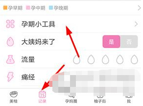 1.想通过美柚来测试孩子性别的话,大家需要准备好唐氏筛查报告的各项数据,然后点击进入“记录”页面里选择“孕期小工具”功能。