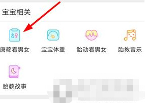 2.接下来从孕期小工具页面的“宝宝相关”列表下,找到并使用“唐筛看男女”功能,就可以测试宝宝的性别了。