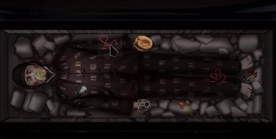 4、右边上到二楼,把朱砂放进书桌上的砚台里,加入茶水,用笔蘸墨水,获得朱砂笔,下楼后对楼梯旁的纸人使用朱砂笔画上眼睛,获得铜钱。左边出门,左边纸人上获得寿鞋。