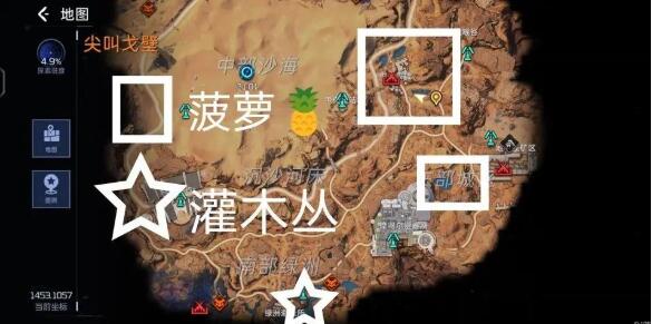 2、花一些时间把小麦种出来,然后按照我标的框来找菠萝。星星部分有很小概率出菠萝,其余两个方块小方块有小概率长菠萝,大方块有大概率有菠萝。其余不靠河的不必要看了,没有真的没有。地图上部分就是仙人掌多,灌木也挺多的,但不推荐太远了。