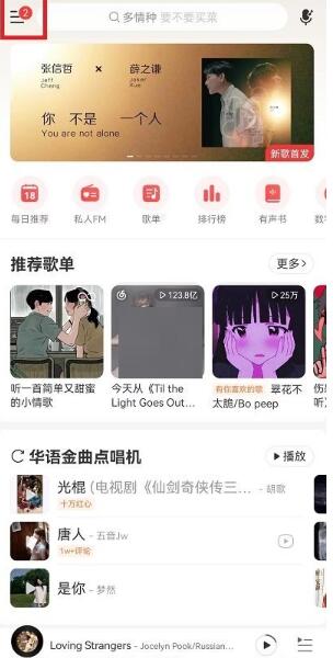 1、首先打开网易云音乐,在软件首页点击左上角的【三】;