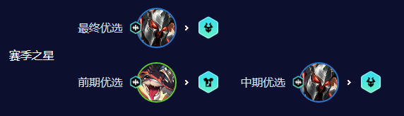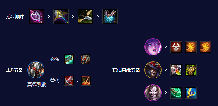 铁男的冕卫是超级粉丝给的,所以他关键的是前两件,饮血剑/科技枪+泰坦,死歌吃青龙刀+大天使,在阿卡丽打残后收割,阿卡丽有五杀转就优先培养,没有转就捡垃圾,肉装可以给掘墓或者妮蔻