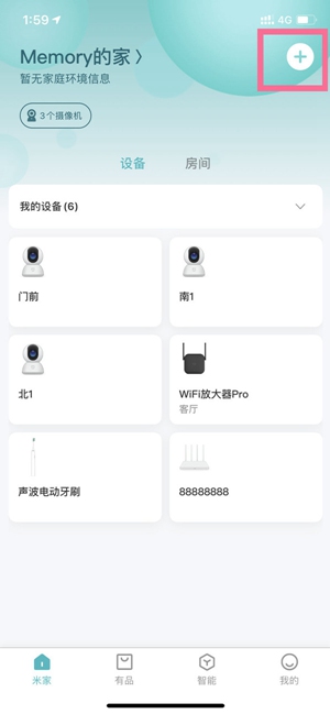 2、打开米家APP,点击右上角【+】,选择摄像头对应型号。