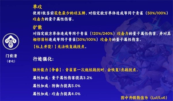 青雀的强化普攻属于扩散攻击,是青雀的主要攻击技能和伤害来源,需要【暗杠】状态激活,使用时会消耗所有手牌,且不会恢复战技点,回复的能量与常规战技一致。如果解锁了额外能力3,还能给自己提供一个加速buff。如果拥有星魂6,则能强化普攻也能恢复战技点。