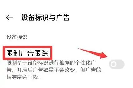 在设备标识与广告界面,将限制广告追踪功能开启就可以跳过广告。