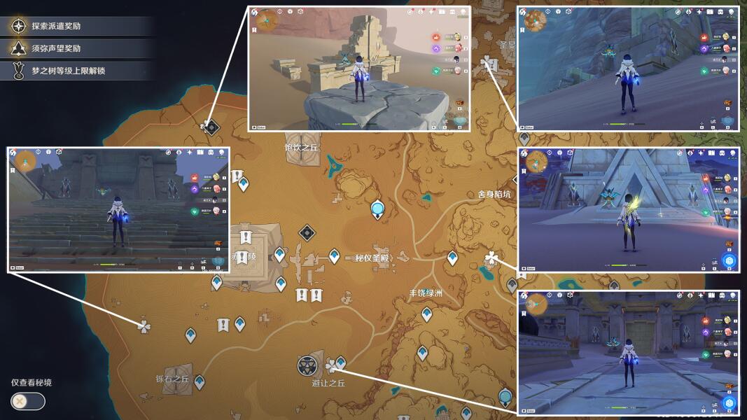 原神沙漠虚影位置在哪?沙漠虚影是我们原神在沙漠地图中登场的全新内容,也是我们想要对“超越时间的虚影”这一成就完成所必须寻找完全的内容,非常具有沙漠特色的“虚影”的它在地图上一共有着五个分布点位,每个点位上有都有着一到两个虚影存在,目标还是非常明显,点位还是非常好找的,不麻烦!那么下面就跟着小编一起前往这五个点位,和这九个虚影来上一张合照,将这一成就顺利的完成吧~