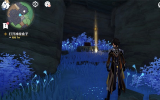 5、我们继续调查石壁下面的蓝色植物,打碎后触发「恒久之约」任务,然后我们需要调查神秘盒子获得笔记,调查完之后任务就完成了;