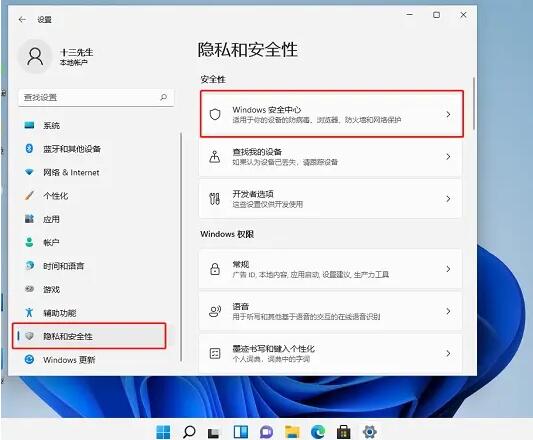 2.也可以按照Win+i快捷键的方式打开设置界面,我们在左边单击隐私和安全功能,进入页面后我们在右侧找到Windows安全中心。