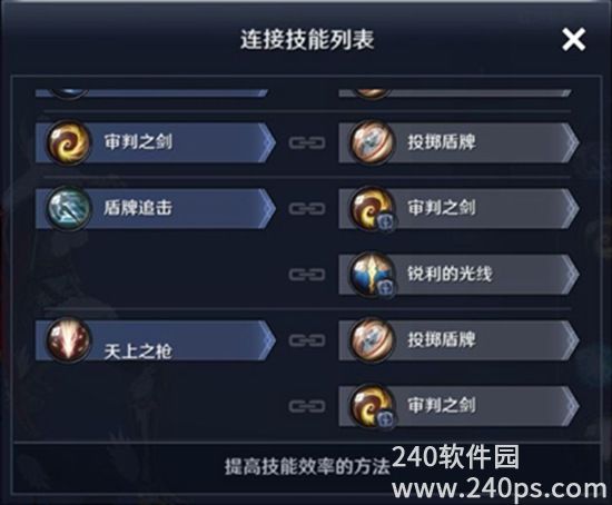 1、技能搭配光线打击、投掷盾牌、审判之剑、锐利的光线、艾利恩的气息、天上之枪、闪光击、天罚。