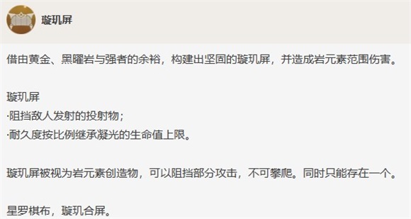 璇玑屏触碰到其他角色的岩元素创造物时,也会直接碎裂。如钟离的岩脊,岩系主角的荒星等。