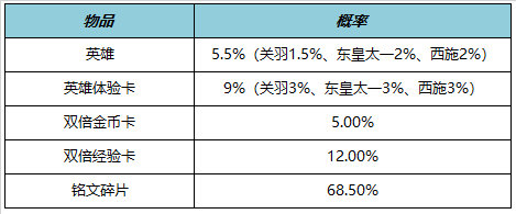 打开后可随机获得以下奖励之一:关羽、东皇太一、西施、英雄体验卡3天、双倍金币卡:1日、双倍经验卡:1日、188/138/108铭文碎片。