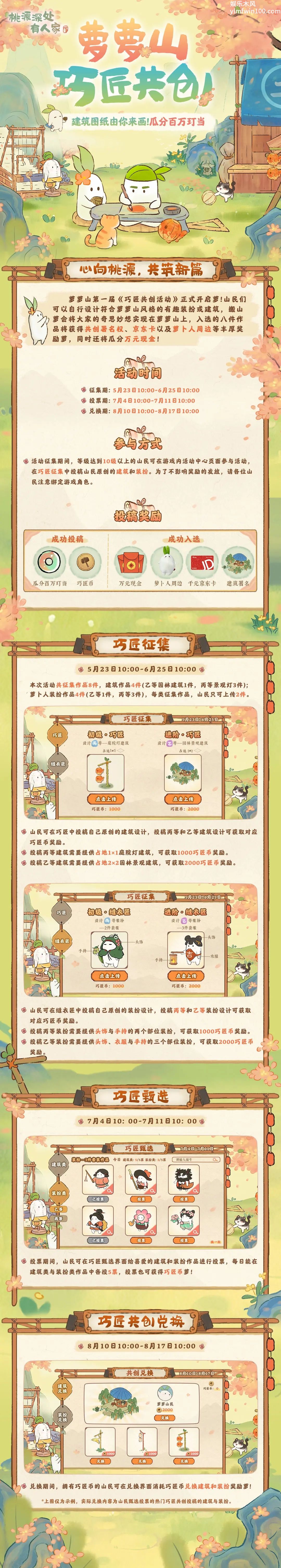 按照活动需求参与投稿就能瓜分百万玎当和巧匠币,入选的八件作品将获得共创署名权、京东卡以及萝卜人周边等丰厚奖励萝,同时还将瓜分万元现金!