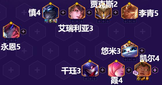 阵容组成:永恩、慎、艾瑞利亚、贾克斯、李青、悠米、千珏、霞、凯尔