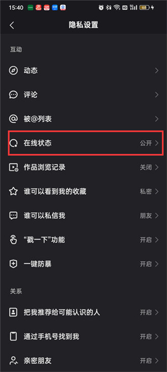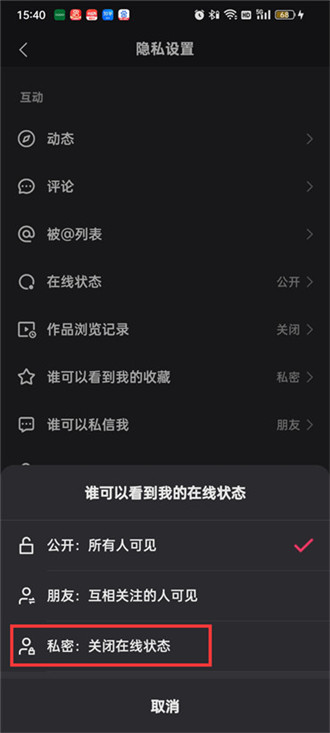 5.点击过后在页面下方弹出的选项中点击【私密:关闭在线状态】即可让别人看不到自己在线;