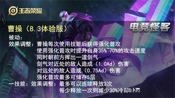 曹操在体验服重做已经有几个月了吧,目前还没走出体验服。之前把曹操被动的强化普攻提升的攻速从固定增加,改成了“翻倍提升”,现在又改回来了。