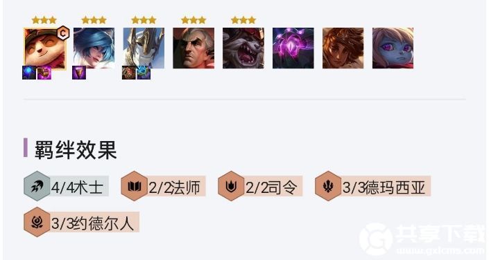 6人口波比、提莫、加里奥、斯维因、克烈、娑娜组成3德玛西亚3约德尔人2术士2司令的基础阵容。