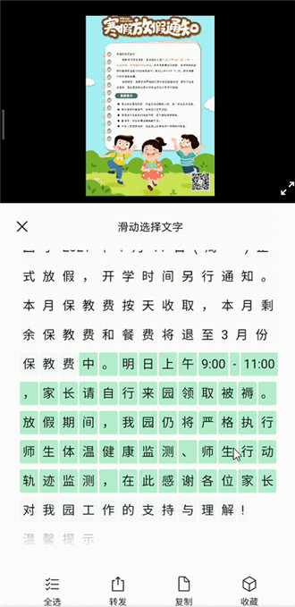 3、如下图就是提取页面,用户们还能选择文字进行复制、收藏、转发等操作。
