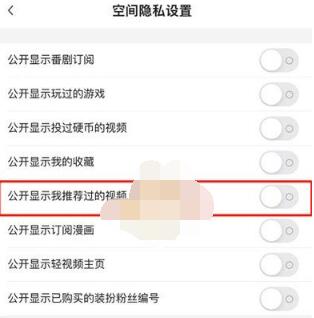 4、最后在空间隐私的设置页面中,找到关于【公开显示我推荐过的视频】的设置选项,点击并关闭开关就可以关闭推荐视频了。