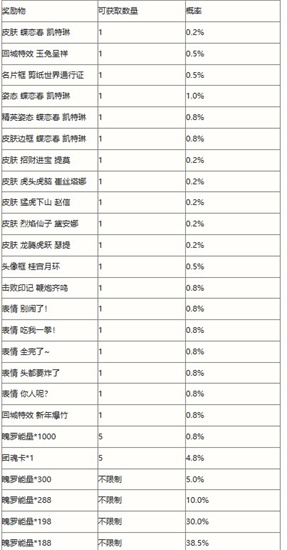 奖池初始概率如下,部分道具存在获取数量限制,超出数量限制后继续开启剪春宝箱则对应道具概率按照初始权重分配至其余奖励中