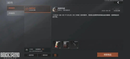 在暗区对局中,玩家携带队友(无论他是否被淘汰)的物资成功撤离后,队友的物资会以邮件的形式归还队友。