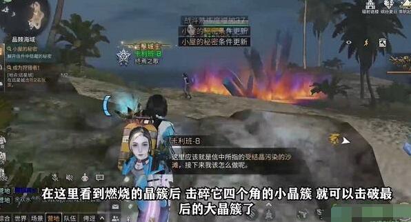 4、之后在这个沙滩上会看到燃烧的晶簇,需要击碎周围四个小晶簇,就可以将大晶簇击破。